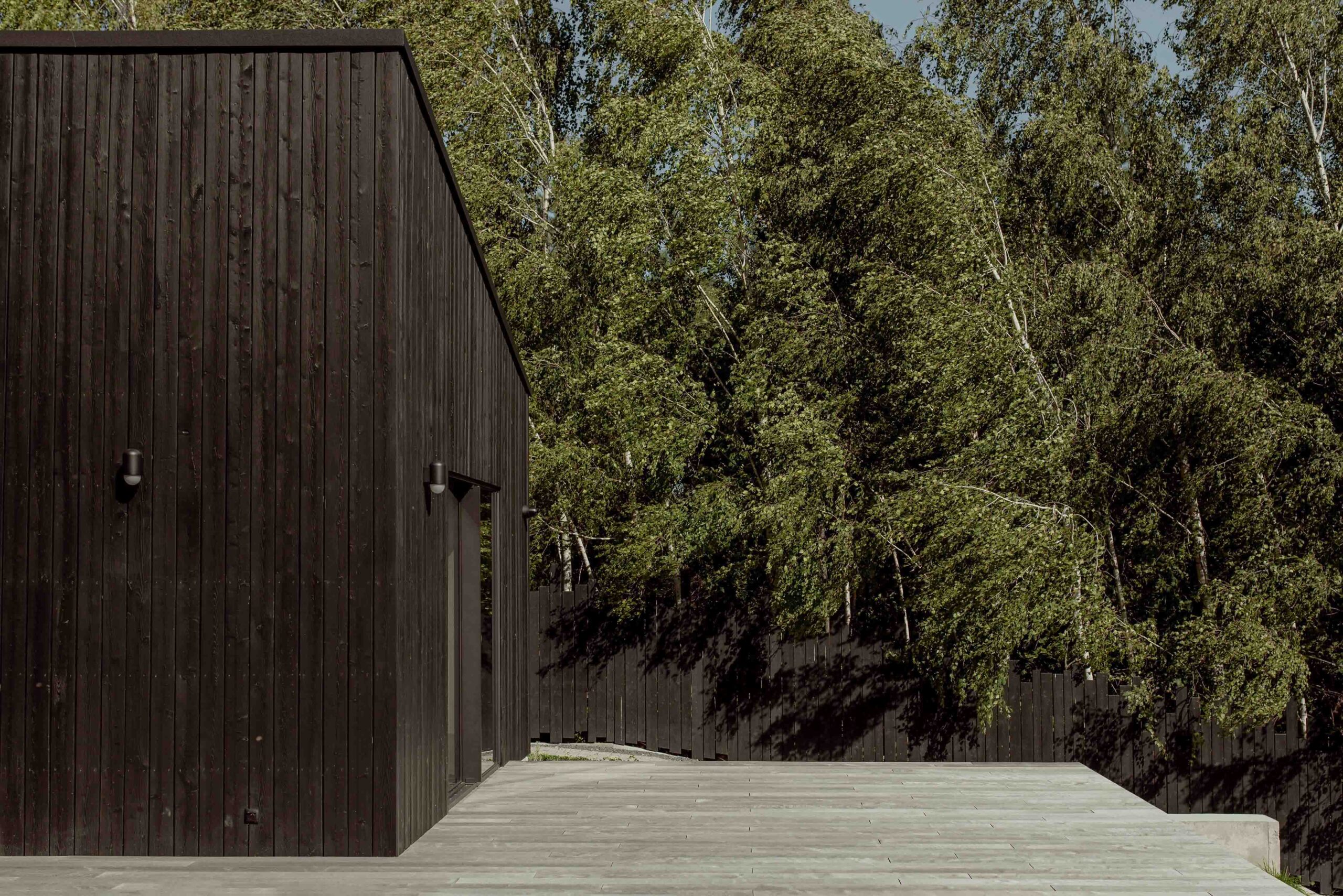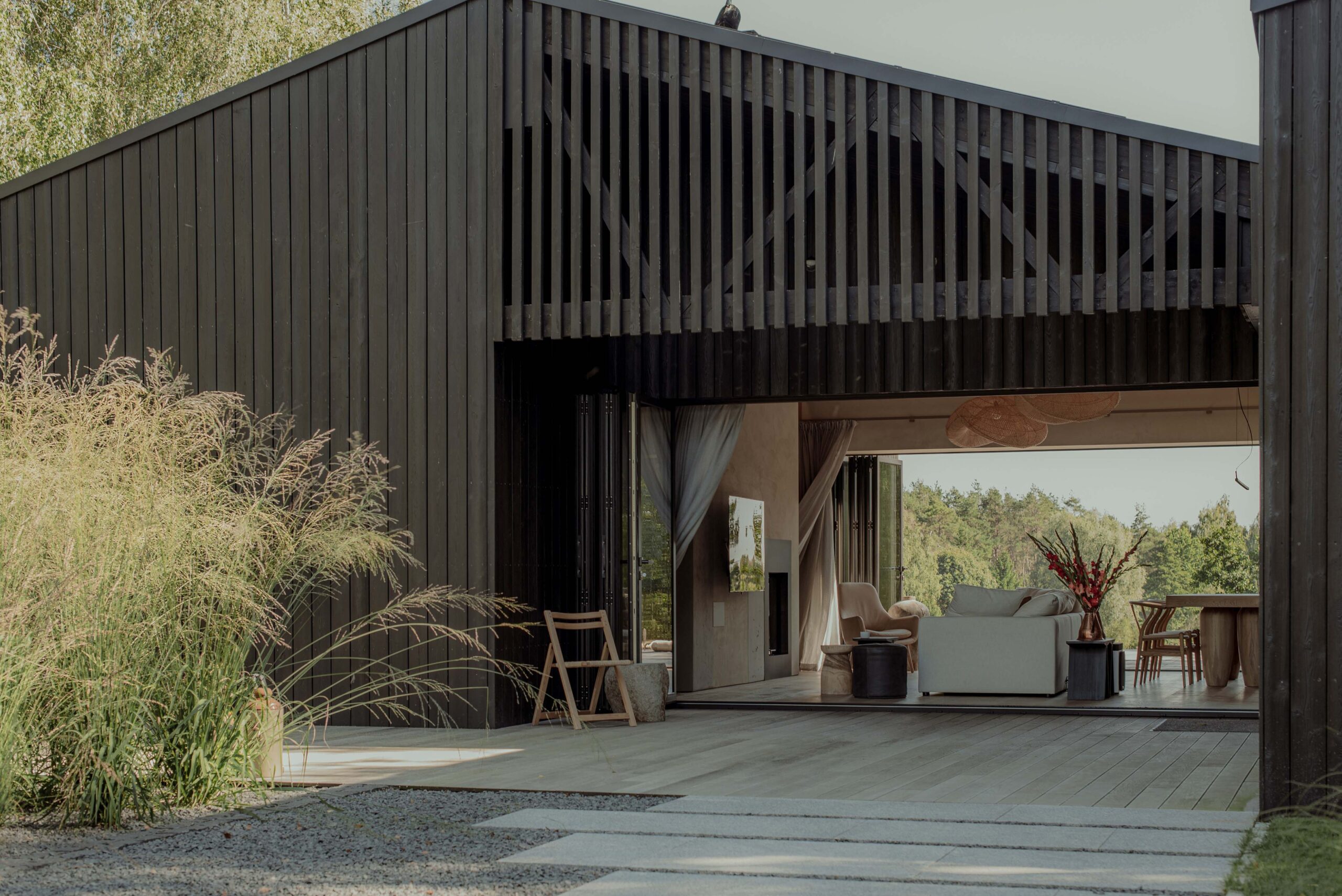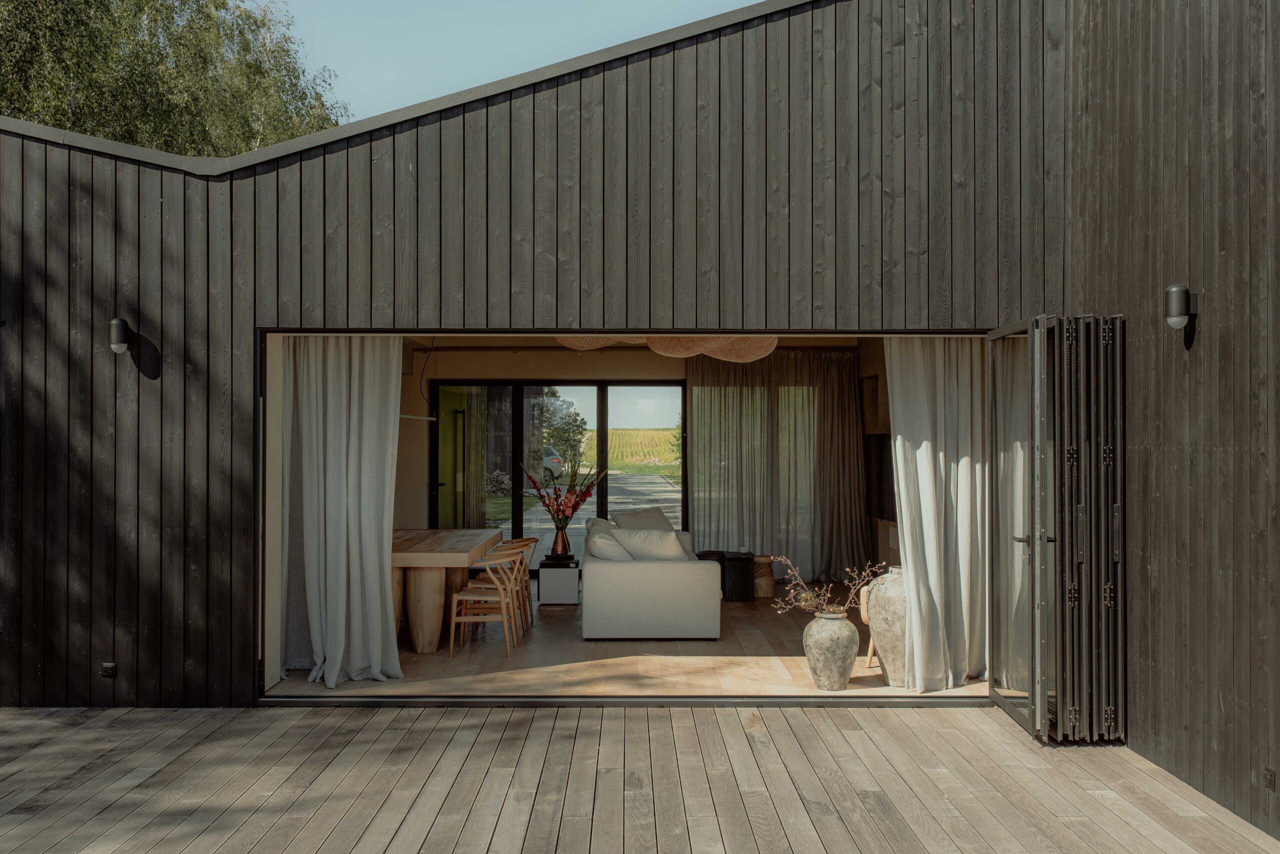 The interior of the house was integrated with the surroundings. This effect was achieved by using accordion windows. They allow the living area to be opened to the lake and the entrance veranda, turning the living room and dining room into a covered terrace.At the same time, this solution allows for passive ventilation of the house by opening both windows on hot days. The common element of both interiors and facades is black wood. The use of fired boards also in the interior finishing enhances the effect of visual interpenetration of the living room and both terraces.