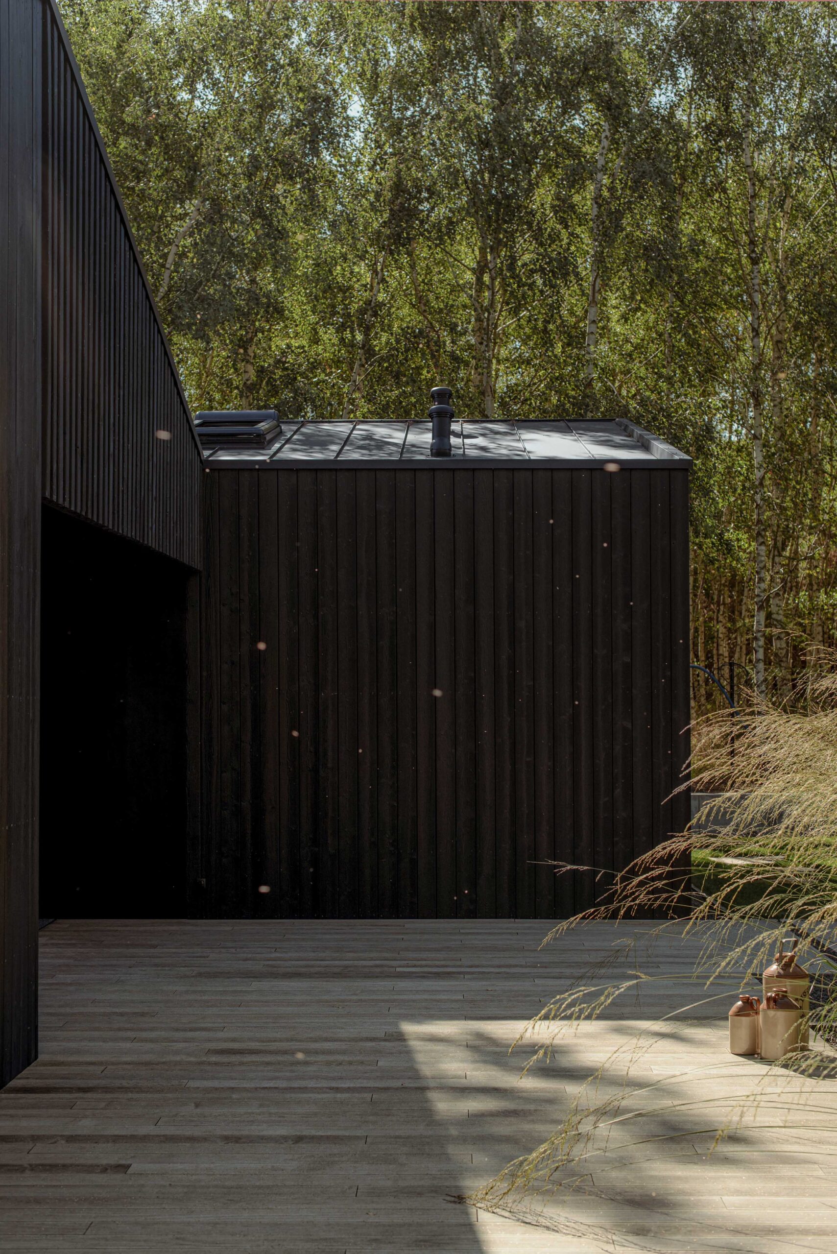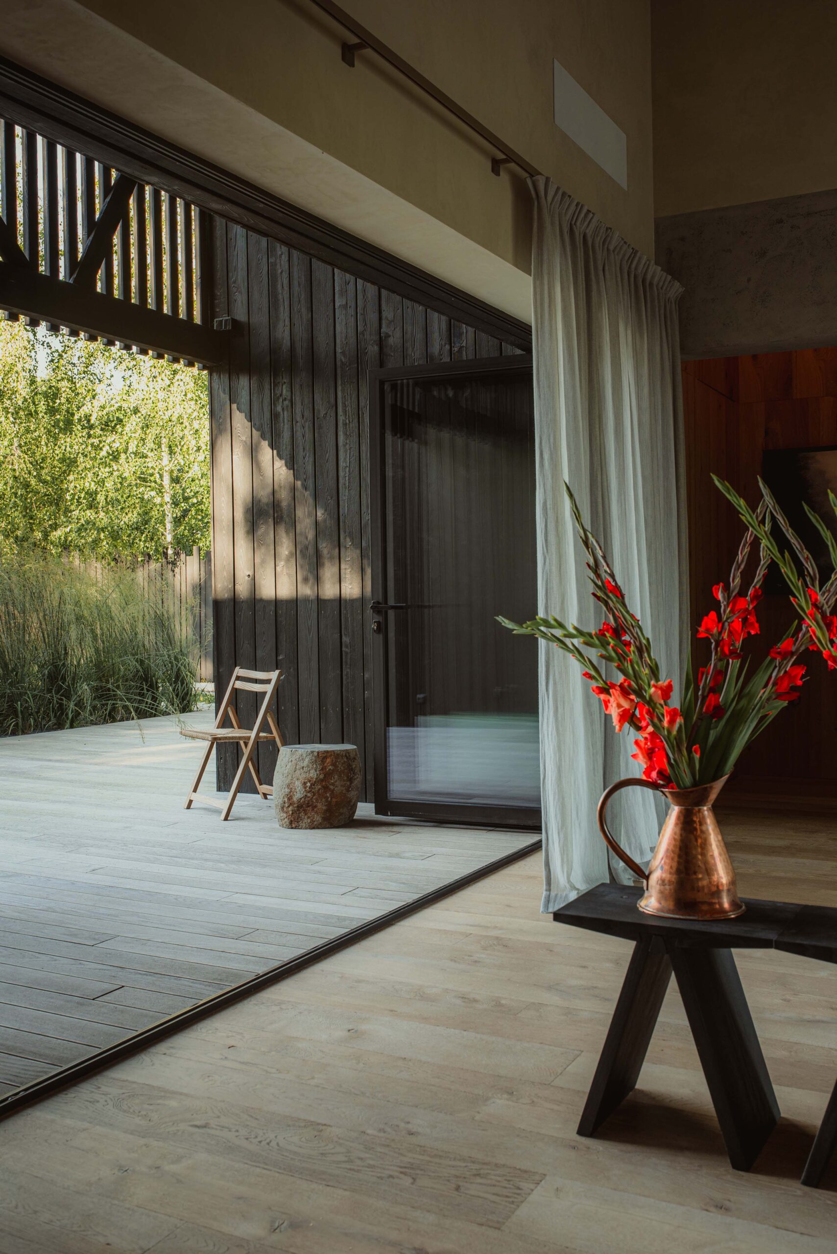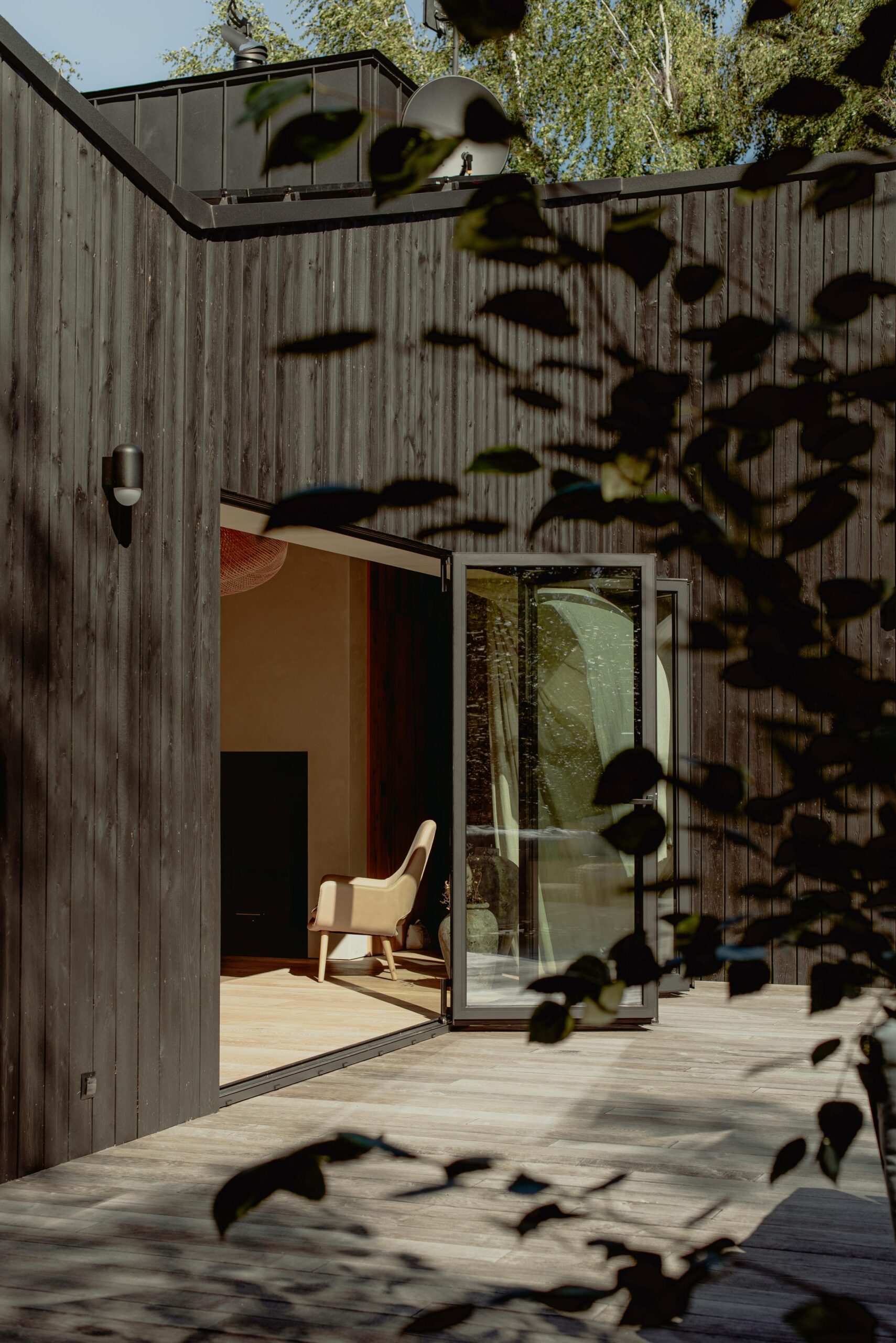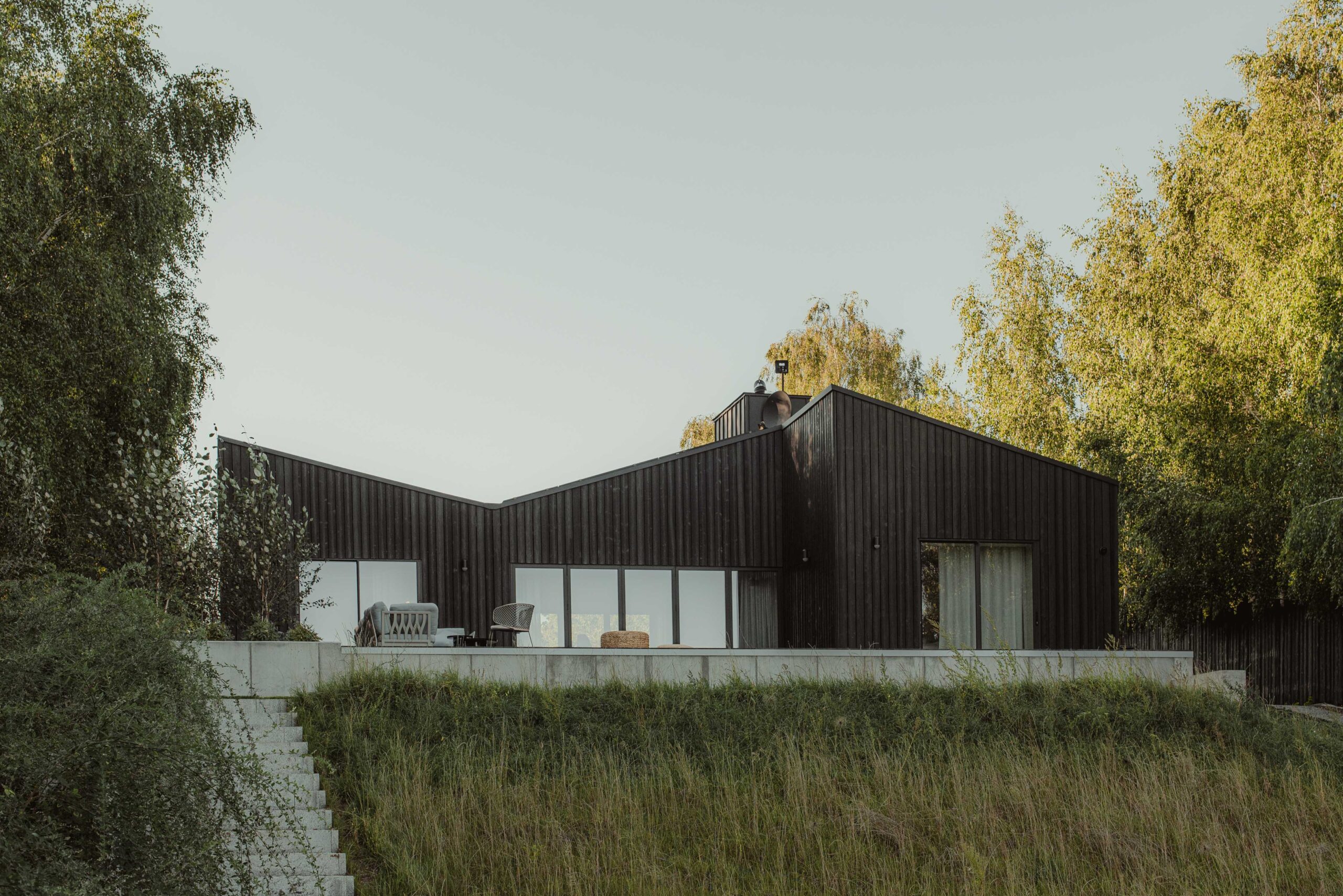 The interior of the house was integrated with the surroundings. This effect was achieved by using accordion windows. They allow the living area to be opened to the lake and the entrance veranda, turning the living room and dining room into a covered terrace.At the same time, this solution allows for passive ventilation of the house by opening both windows on hot days. The common element of both interiors and facades is black wood. The use of fired boards also in the interior finishing enhances the effect of visual interpenetration of the living room and both terraces.